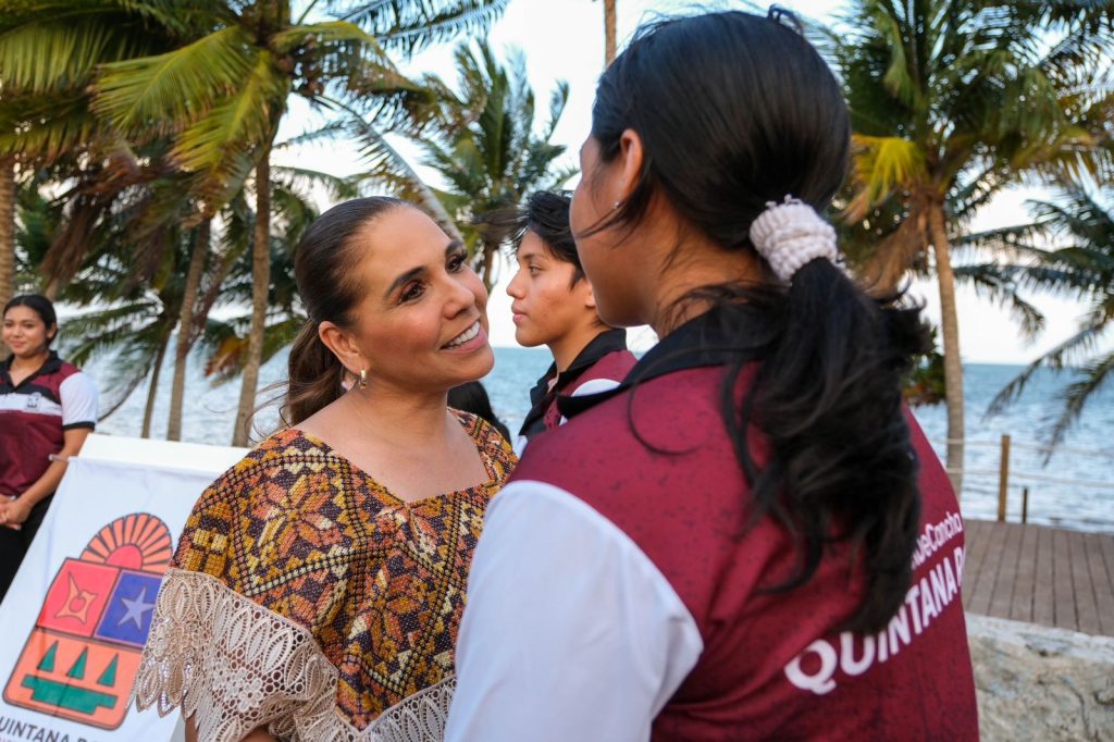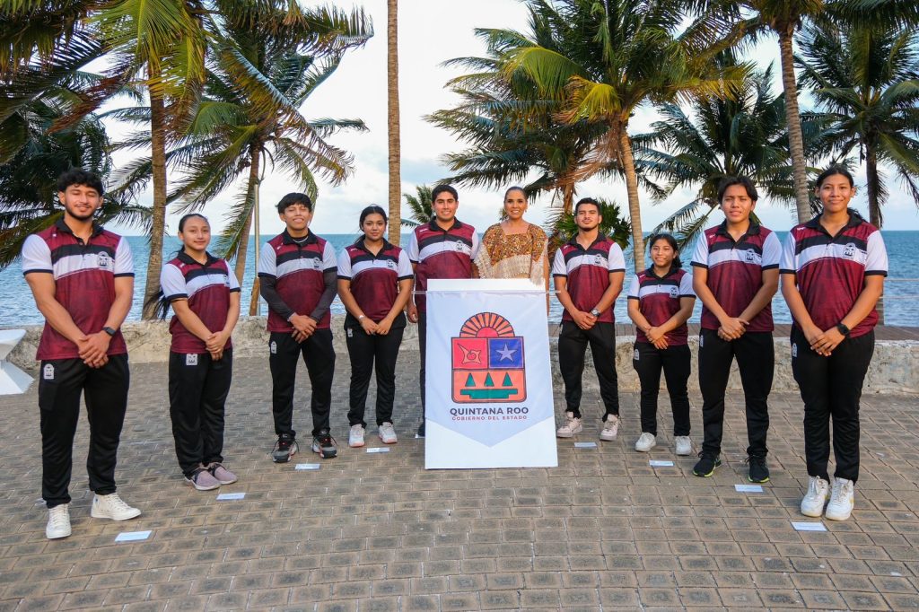 Teniendo como hermoso marco de fondo la Playa Coral de Cancún, la titular del Ejecutivo, acompañada de Jacobo Arzate Hop, titular de la Comisión del Deporte de Quintana Roo (CODEQ), realizó el abanderamiento haciendo entrega del escudo del Estado a las y los deportistas, en una ceremonia simbólica.